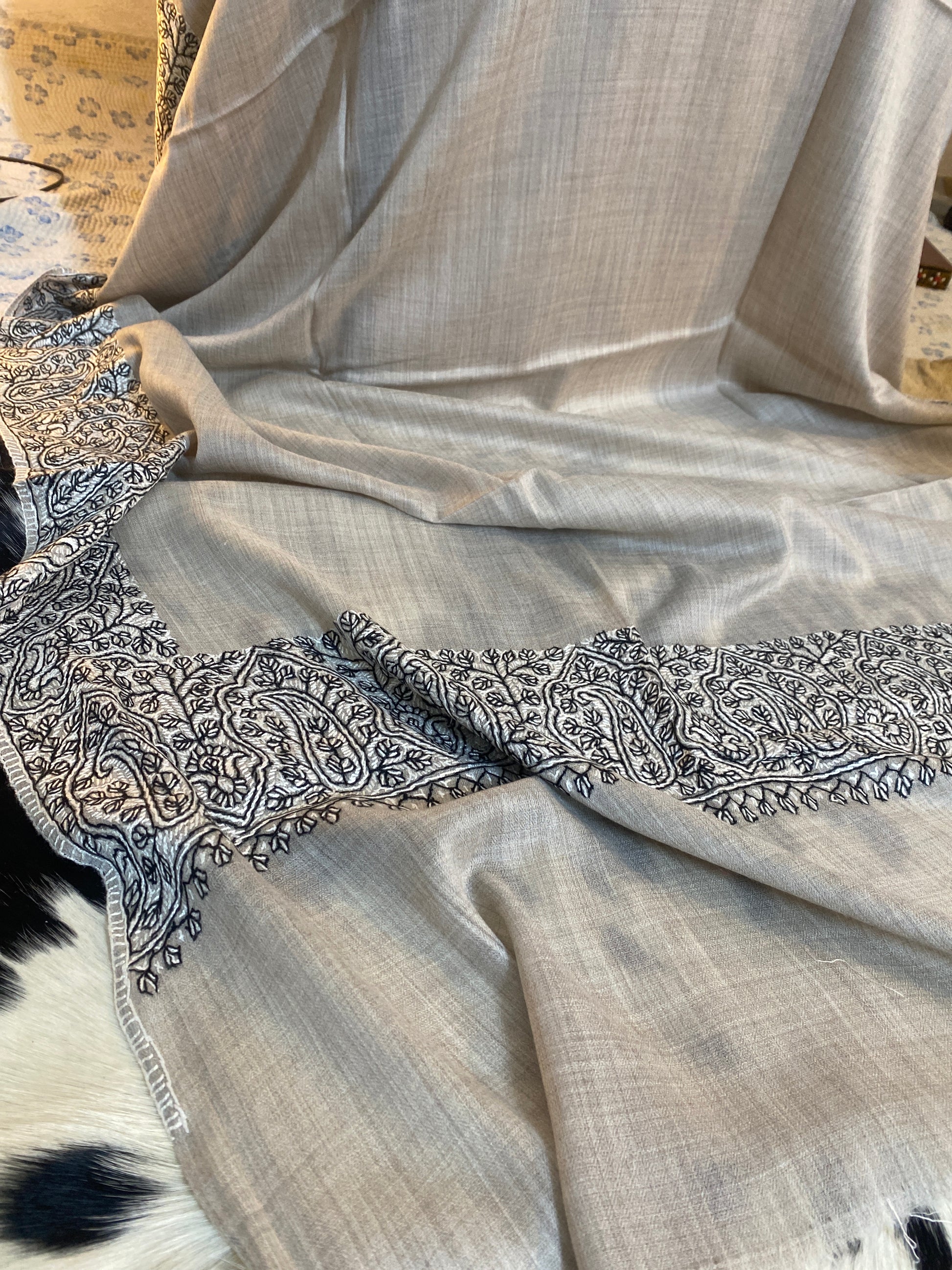 Kashmiri Pashmina Jamawar Light Gray 4 Border